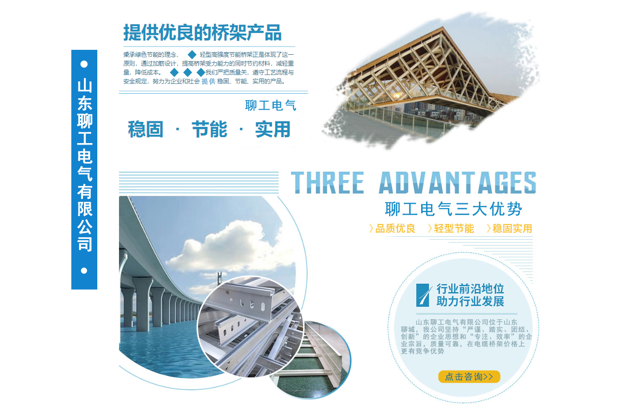 山東聊工電氣有限公司位于山東聊城,是一家銷售各類橋架的公司,公司主營鍍鋅防火噴塑橋架,鍍鋅防火電纜橋架 ,不銹鋼電纜橋架,熱浸鋅電纜橋架,鋁合金電纜橋架,熱鍍鋅電纜橋架,梯式電纜橋架等我公司堅持“嚴(yán)謹(jǐn)、踏實、團結(jié)、創(chuàng)新”的企業(yè)思想和“專注、效率”的企業(yè)宗旨,質(zhì)量可靠,在電纜橋架價格上更有競爭優(yōu)勢。公司追求品質(zhì),配有研發(fā)人員,進(jìn)行產(chǎn)品的改革和創(chuàng)新,服務(wù)先進(jìn)走出了一條富有企業(yè)特色的可持續(xù)化發(fā)展之路! 我公司鄭重向你承諾:保證最好的質(zhì)量,以低的價格,完善的售后服務(wù),來答謝新老客戶。可提前電話聯(lián)系。...